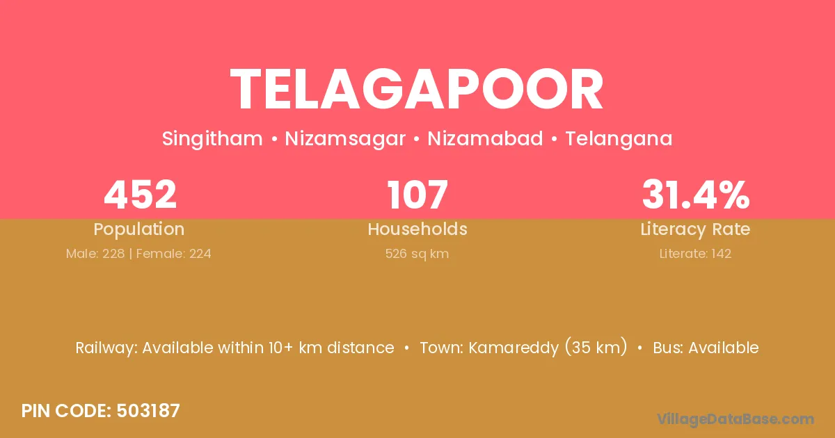 Kamareddy (35 km) is the nearest town to Telagapoor village for major economic activities and is located approximately 35 km away.
