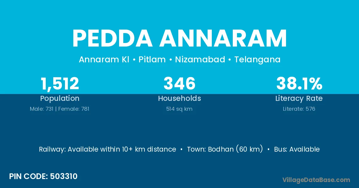 Bodhan (60 km) is the nearest town to Pedda Annaram village for major economic activities and is located approximately 60 km away.