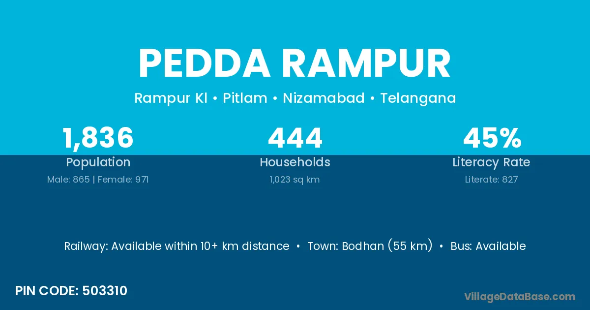 Bodhan (55 km) is the nearest town to Pedda Rampur village for major economic activities and is located approximately 55 km away.