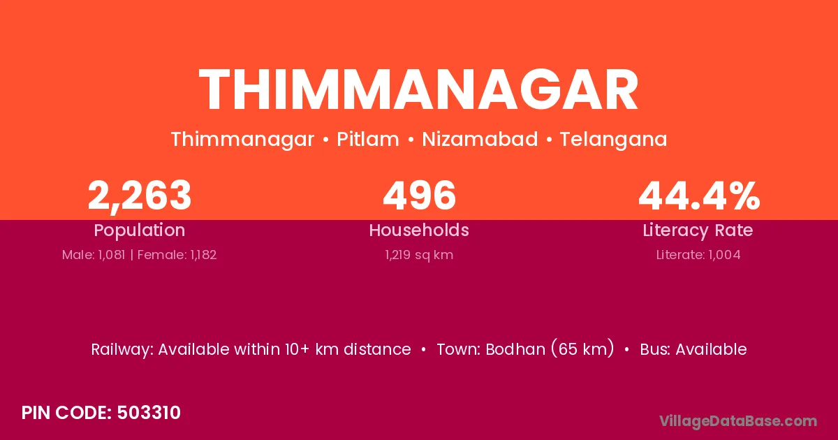 Bodhan (65 km) is the nearest town to Thimmanagar village for major economic activities and is located approximately 65 km away.
