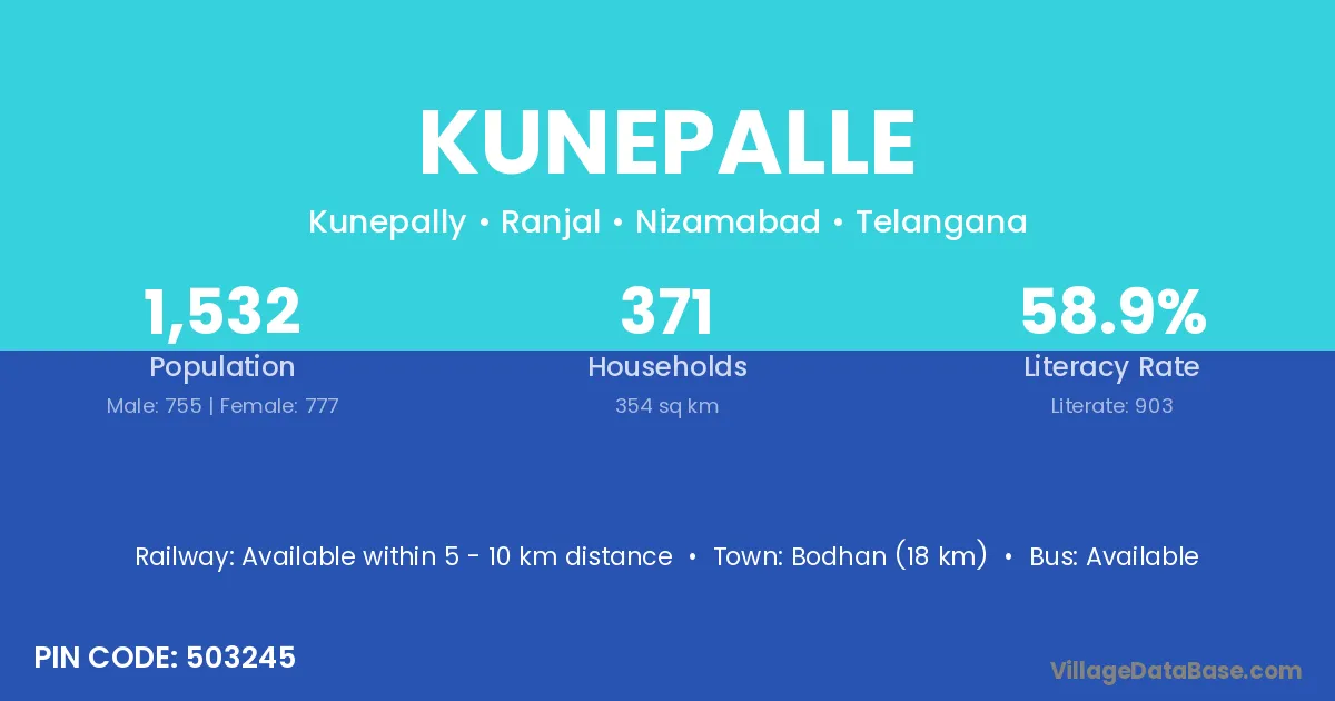 Bodhan (18 km) is the nearest town to Kunepalle village for major economic activities and is located approximately 18 km away.