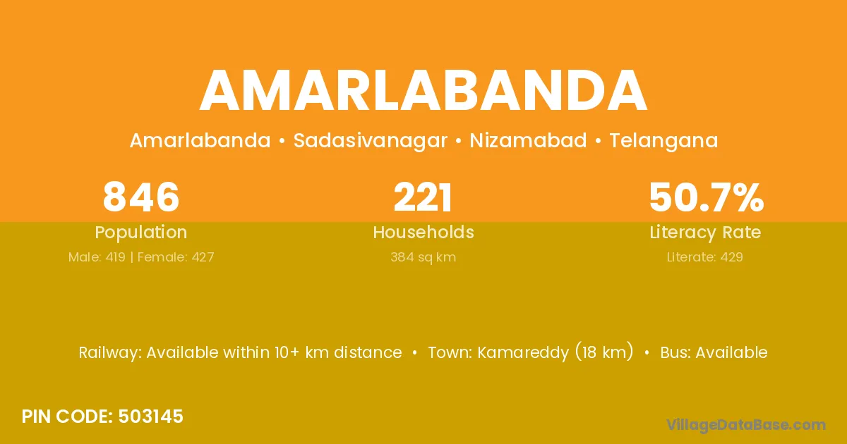 Kamareddy (18 km) is the nearest town to Amarlabanda village for major economic activities and is located approximately 18 km away.