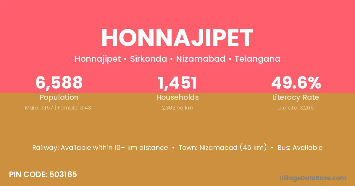 Nizamabad (45 km) is the nearest town to Honnajipet village for major economic activities and is located approximately 45 km away.