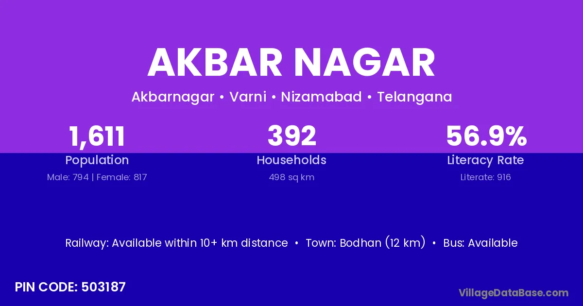 Bodhan (12 km) is the nearest town to Akbar Nagar village for major economic activities and is located approximately 12 km away.