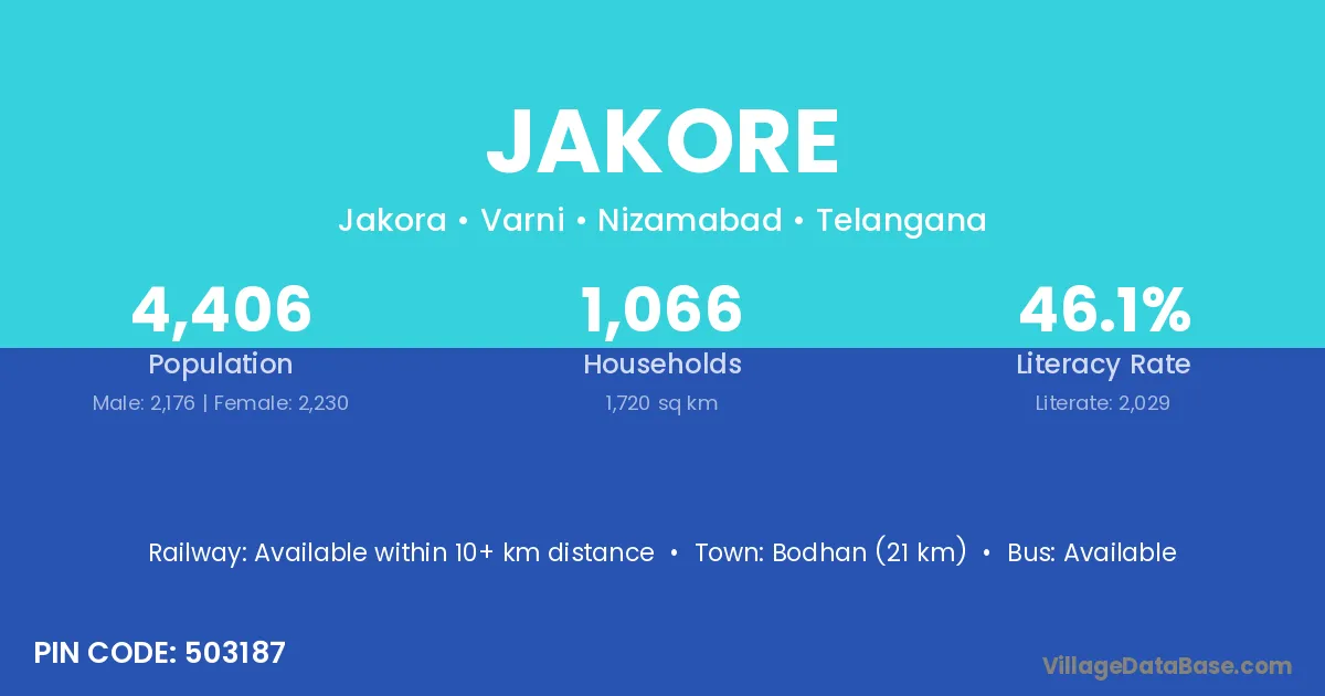 Bodhan (21 km) is the nearest town to Jakore village for major economic activities and is located approximately 21 km away.