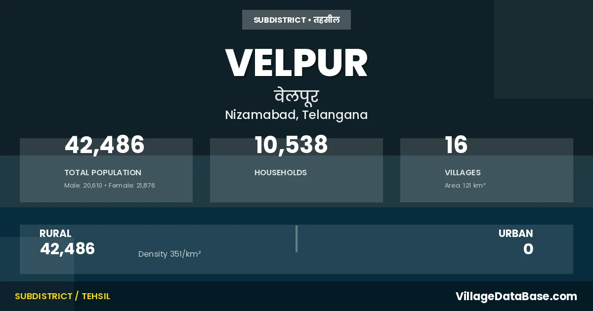 According to the 2011 census The total area of Velpur Mandal is 121 km², with a population of 42486 people. The population density is 351 inhabitants per square kilometre, and there are approximately 10538 houses in the sub district.