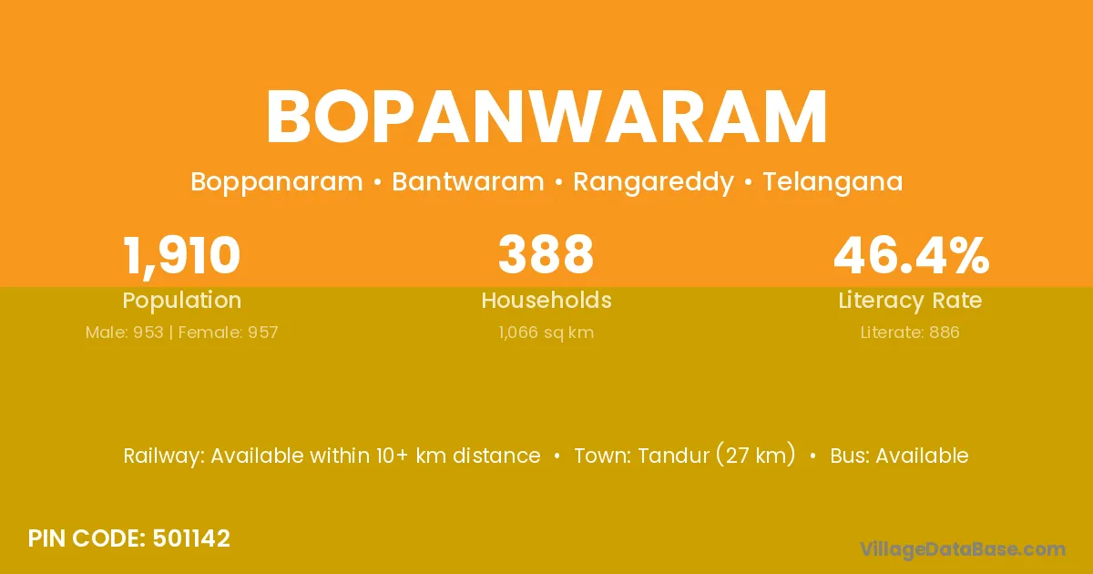 Tandur (27 km) is the nearest town to Bopanwaram village for major economic activities and is located approximately 27 km away.