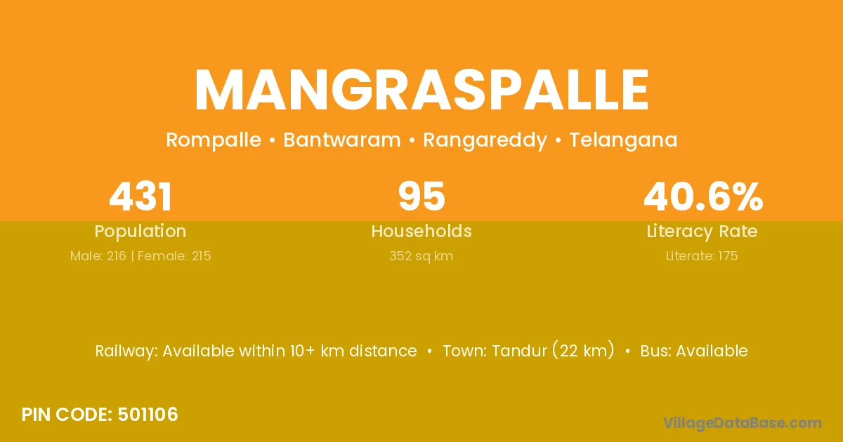 Tandur (22 km) is the nearest town to Mangraspalle village for major economic activities and is located approximately 22 km away.