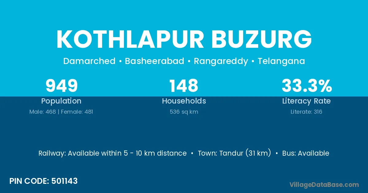 Tandur (31 km) is the nearest town to Kothlapur Buzurg village for major economic activities and is located approximately 31 km away.