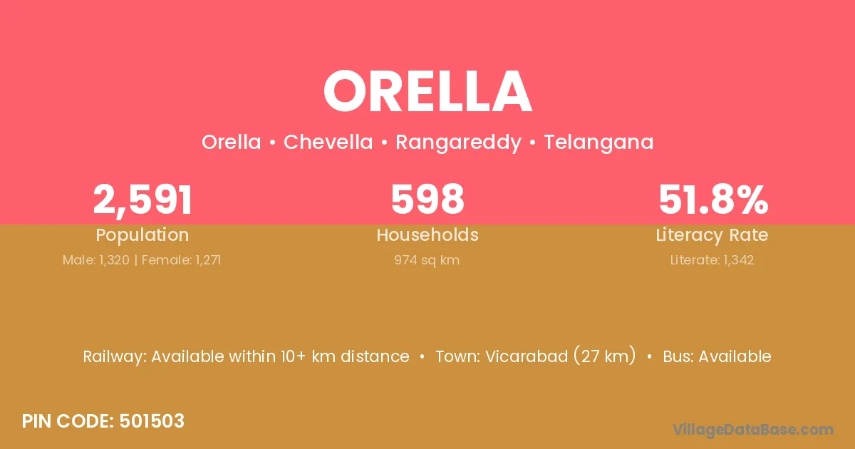 Vicarabad (27 km) is the nearest town to Orella village for major economic activities and is located approximately 27 km away.
