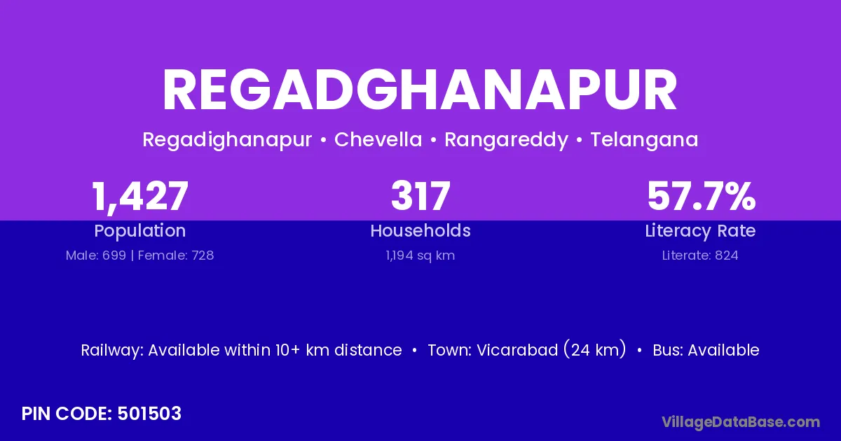 Vicarabad (24 km) is the nearest town to Regadghanapur village for major economic activities and is located approximately 24 km away.
