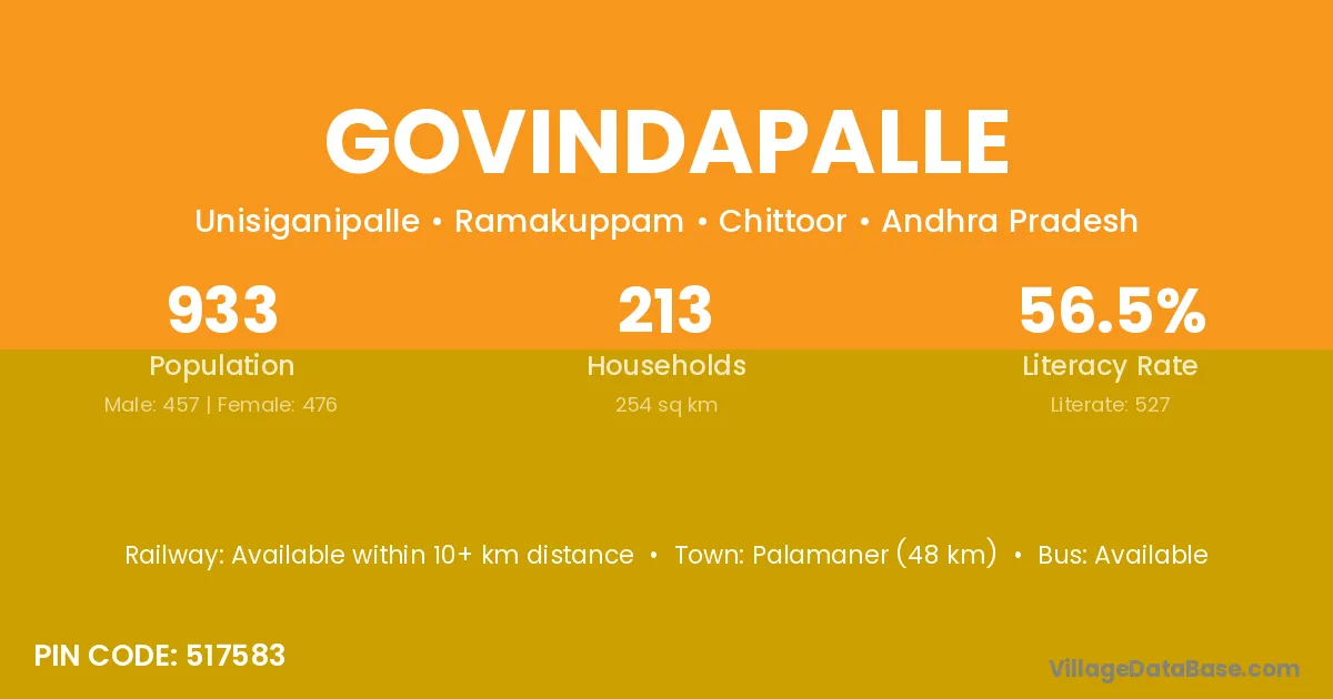 The literacy rate of Govindapalle village is 31.46%. Male literacy stands at 36.40% and female literacy at 26.56%.