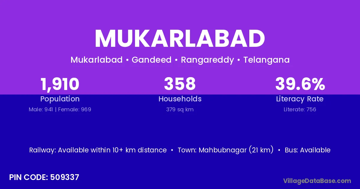 Mahbubnagar (21 km) is the nearest town to Mukarlabad village for major economic activities and is located approximately 21 km away.