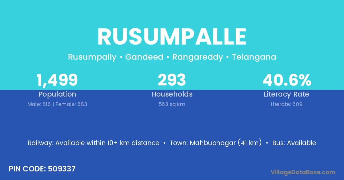 Mahbubnagar (41 km) is the nearest town to Rusumpalle village for major economic activities and is located approximately 41 km away.