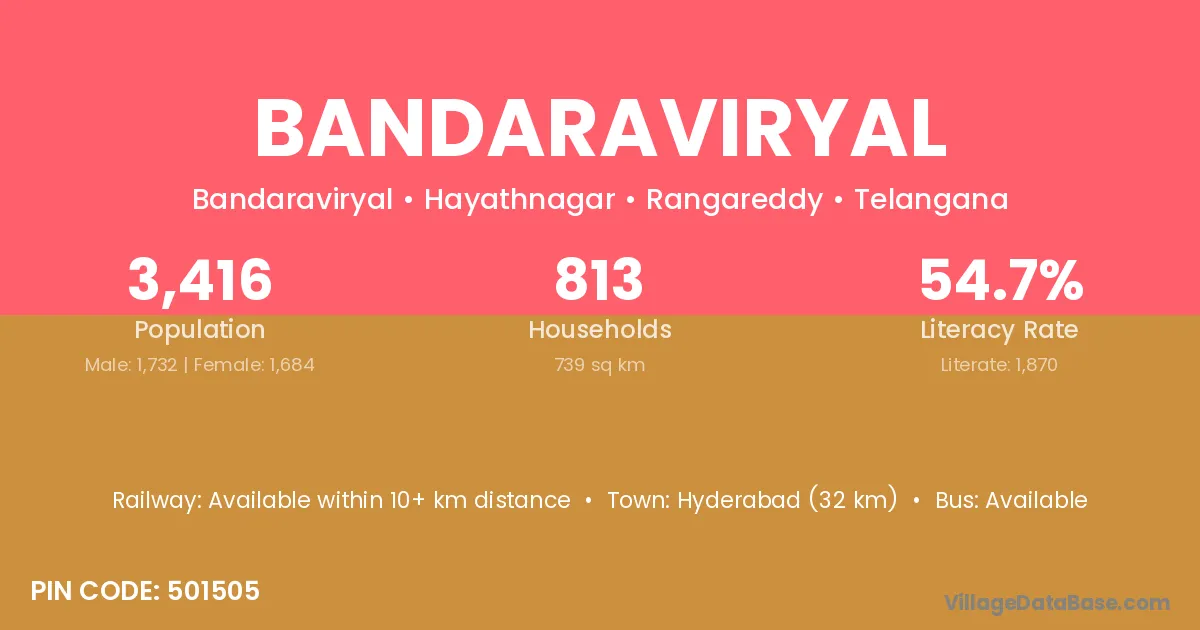 Hyderabad (32 km) is the nearest town to Bandaraviryal village for major economic activities and is located approximately 32 km away.