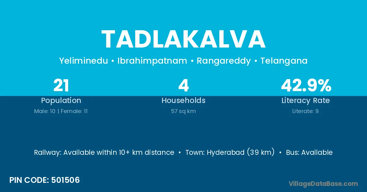 Hyderabad (39 km) is the nearest town to Tadlakalva village for major economic activities and is located approximately 39 km away.