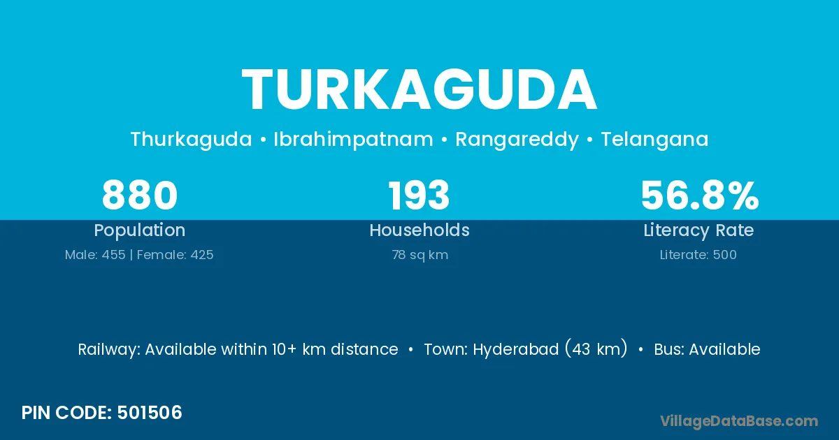 Hyderabad (43 km) is the nearest town to Turkaguda village for major economic activities and is located approximately 43 km away.