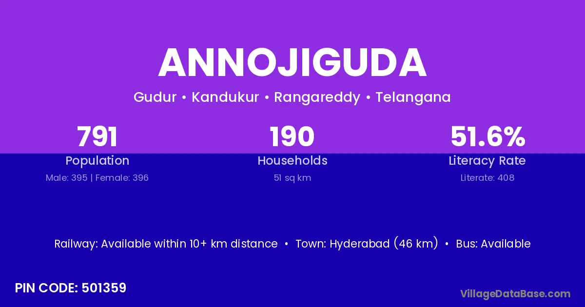 Hyderabad (46 km) is the nearest town to Annojiguda village for major economic activities and is located approximately 46 km away.