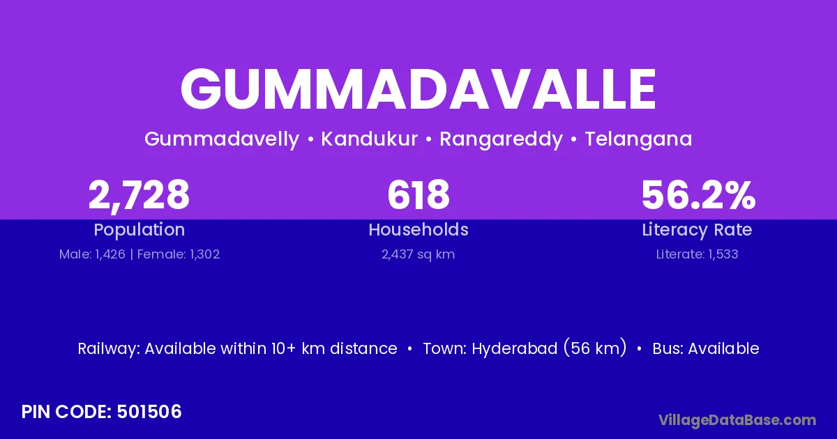 Hyderabad (56 km) is the nearest town to Gummadavalle village for major economic activities and is located approximately 56 km away.
