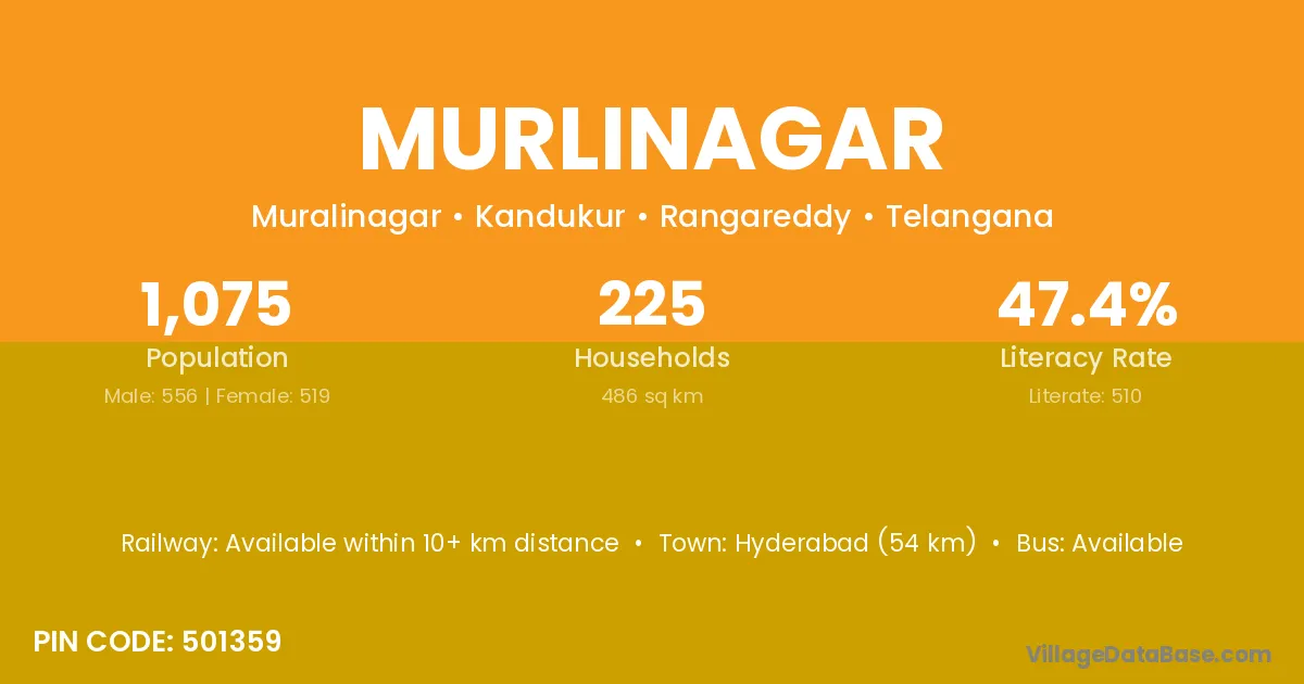 Hyderabad (54 km) is the nearest town to Murlinagar village for major economic activities and is located approximately 54 km away.