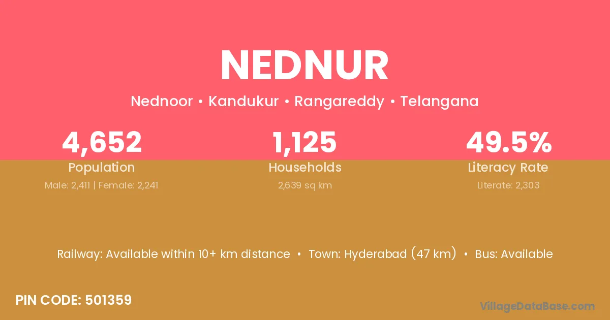 Hyderabad (47 km) is the nearest town to Nednur village for major economic activities and is located approximately 47 km away.