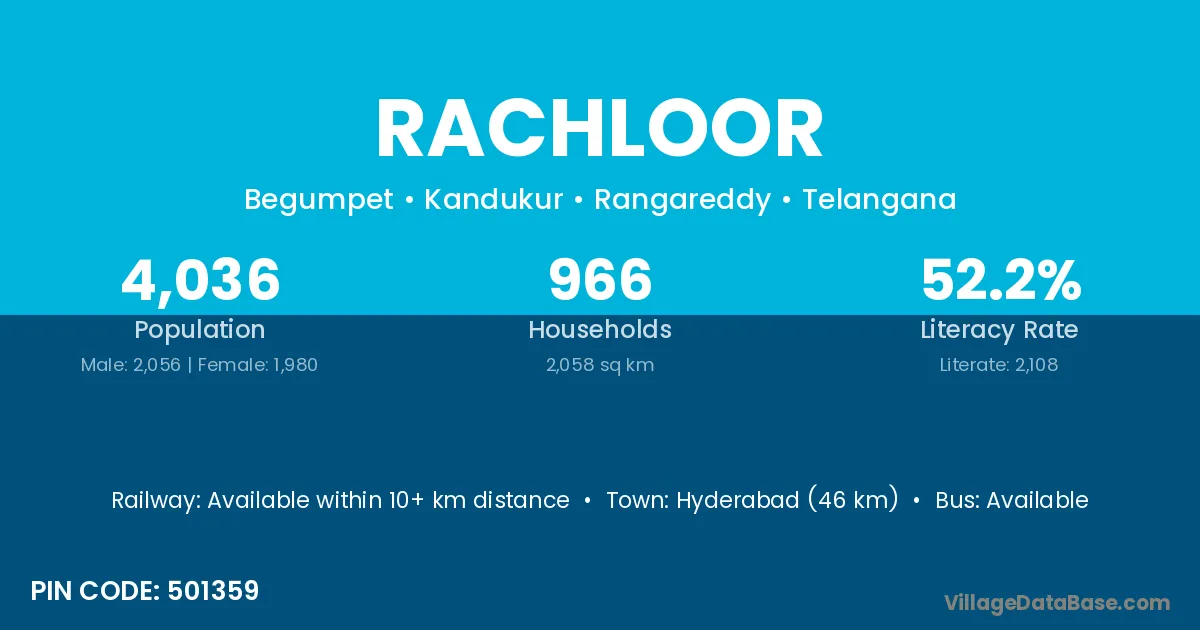Hyderabad (46 km) is the nearest town to Rachloor village for major economic activities and is located approximately 46 km away.