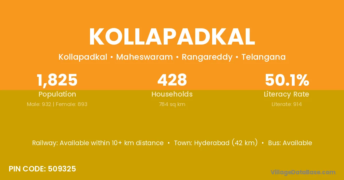 Hyderabad (42 km) is the nearest town to Kollapadkal village for major economic activities and is located approximately 42 km away.