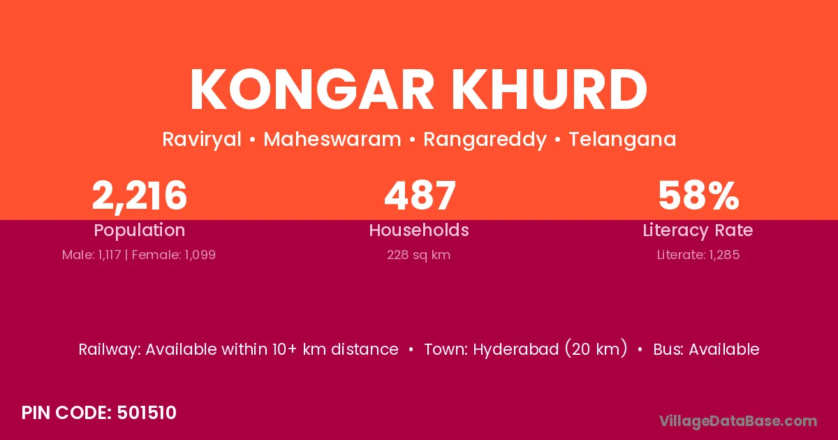 Hyderabad (20 km) is the nearest town to Kongar Khurd village for major economic activities and is located approximately 20 km away.