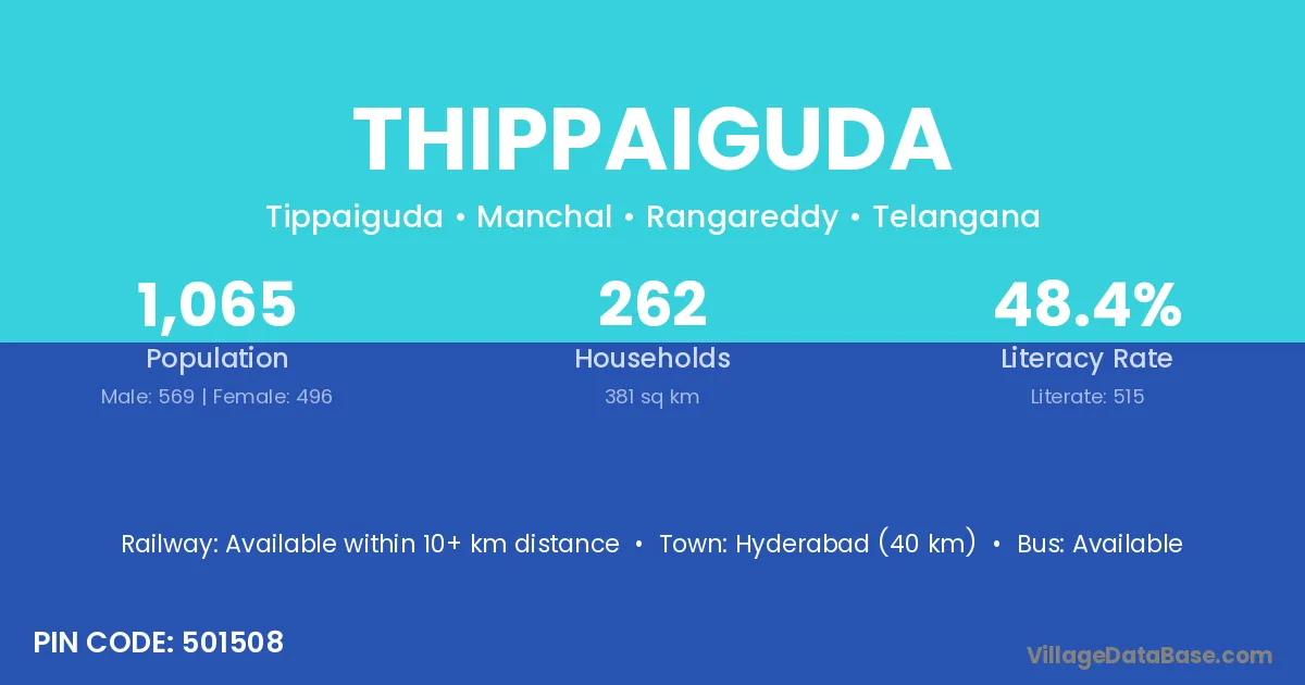 Hyderabad (40 km) is the nearest town to Thippaiguda village for major economic activities and is located approximately 40 km away.
