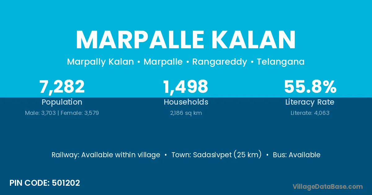 Sadasivpet (25 km) is the nearest town to Marpalle Kalan village for major economic activities and is located approximately 25 km away.