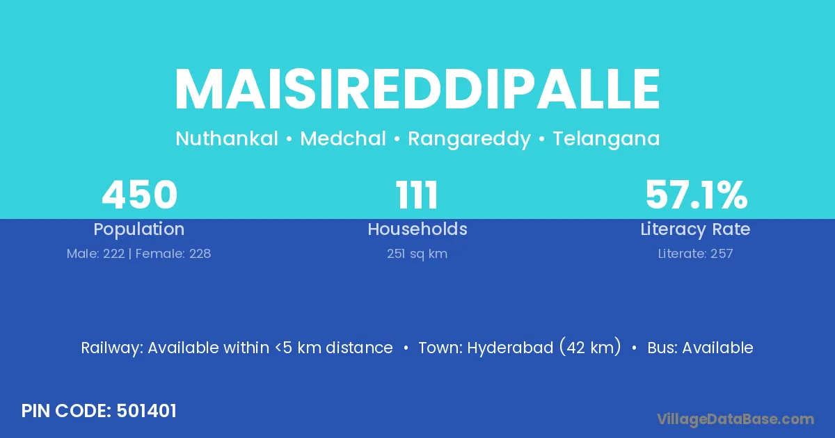 Hyderabad (42 km) is the nearest town to Maisireddipalle village for major economic activities and is located approximately 42 km away.
