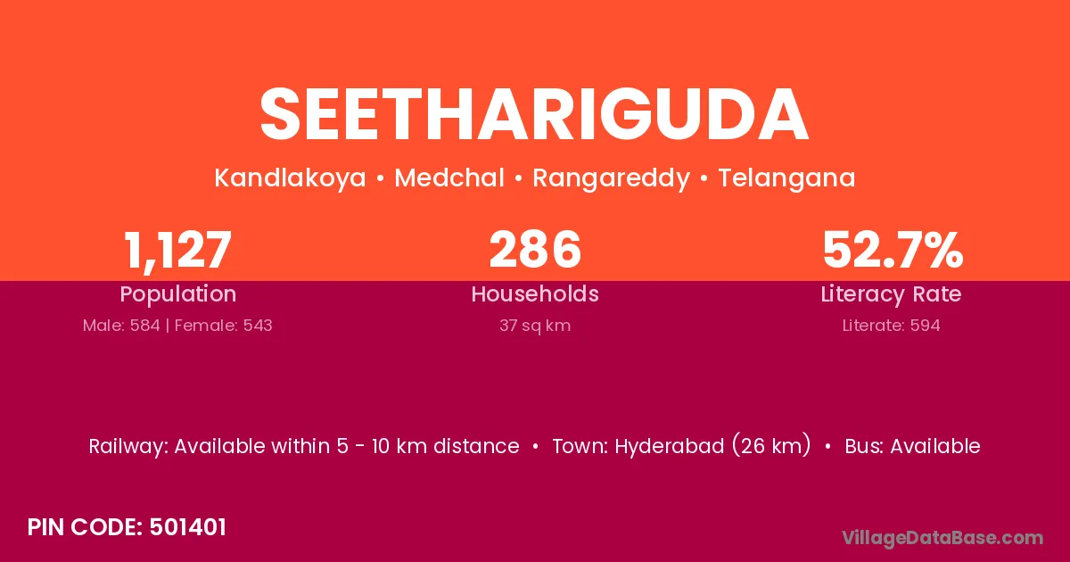Seethariguda village has a total population of 1,127 people, of which 584 are males and 543 are females.