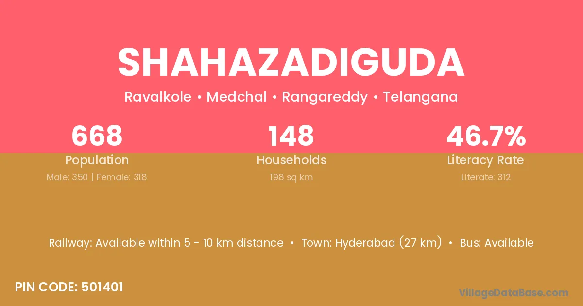 According to Census 2011 information, the village code of Shahazadiguda village is 501401.