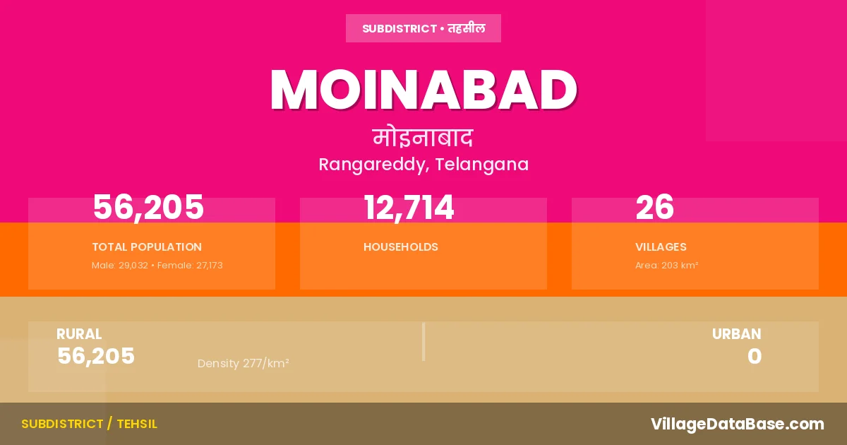 According to the 2011 census The total area of Moinabad Mandal is 203 km², with a population of 56205 people. The population density is 277 inhabitants per square kilometre, and there are approximately 12714 houses in the sub district.