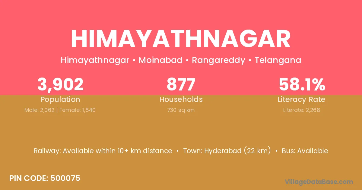 Himayathnagar village has a total population of 3,902 people, of which 2,062 are males and 1,840 are females.