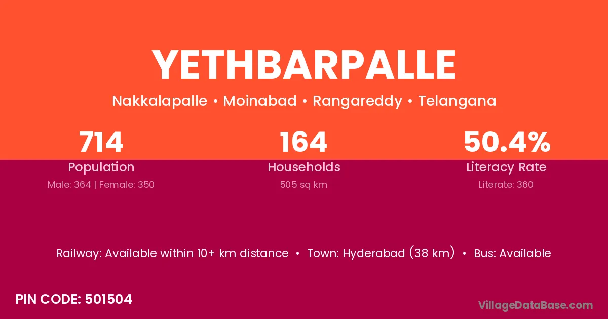 Hyderabad (38 km) is the nearest town to Yethbarpalle village for major economic activities and is located approximately 38 km away.