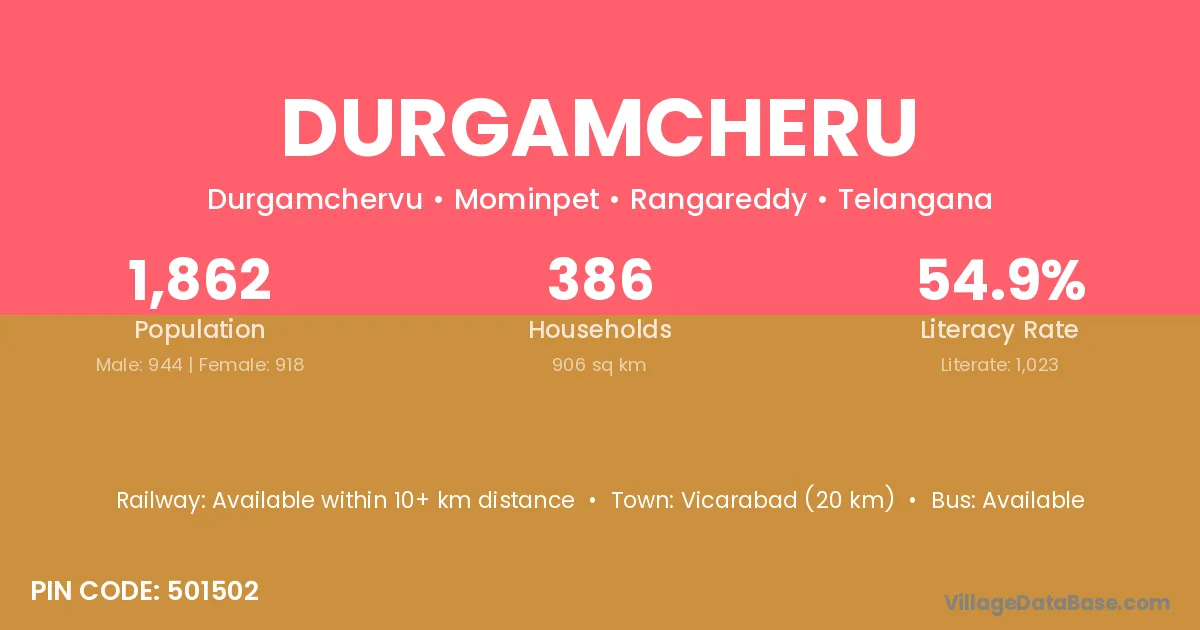 Vicarabad (20 km) is the nearest town to Durgamcheru village for major economic activities and is located approximately 20 km away.