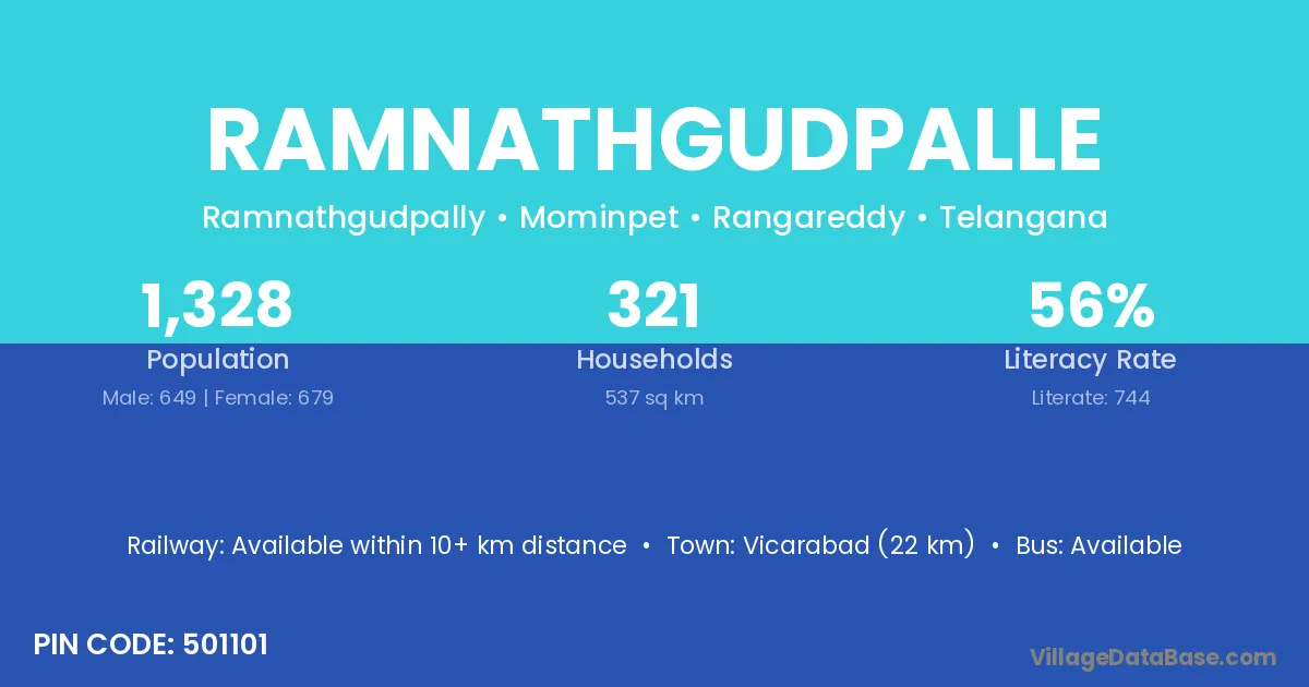 Vicarabad (22 km) is the nearest town to Ramnathgudpalle village for major economic activities and is located approximately 22 km away.