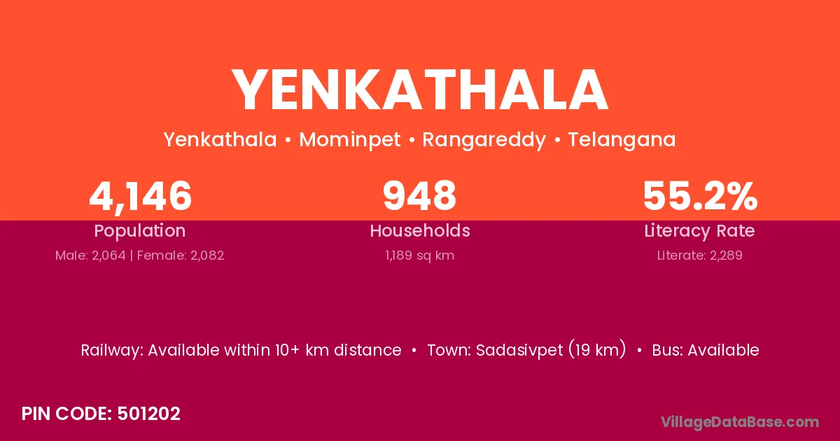 Sadasivpet (19 km) is the nearest town to Yenkathala village for major economic activities and is located approximately 19 km away.