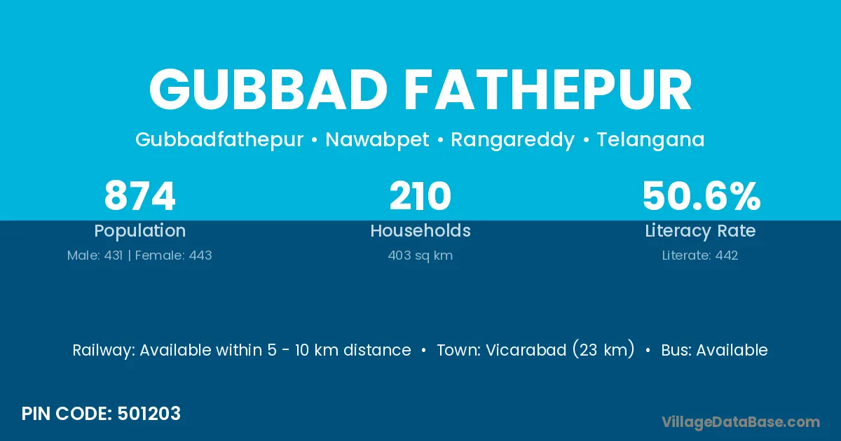Vicarabad (23 km) is the nearest town to Gubbad Fathepur village for major economic activities and is located approximately 23 km away.