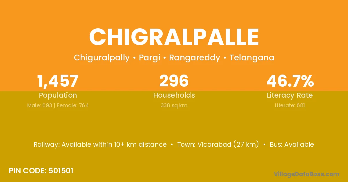 Vicarabad (27 km) is the nearest town to Chigralpalle village for major economic activities and is located approximately 27 km away.