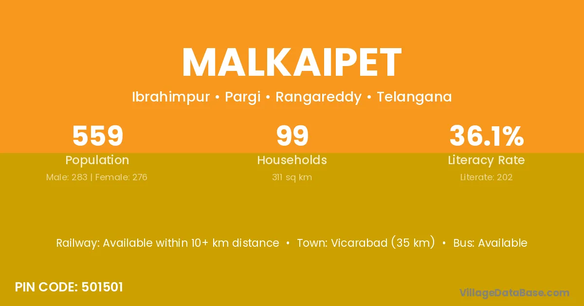 Vicarabad (35 km) is the nearest town to Malkaipet village for major economic activities and is located approximately 35 km away.