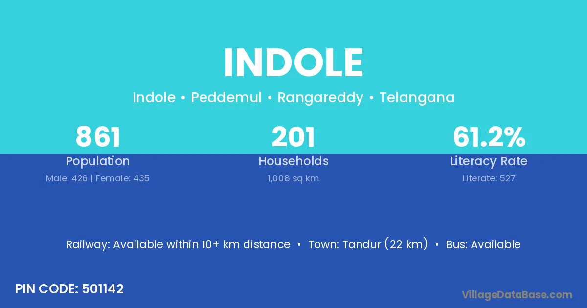 Tandur (22 km) is the nearest town to Indole village for major economic activities and is located approximately 22 km away.