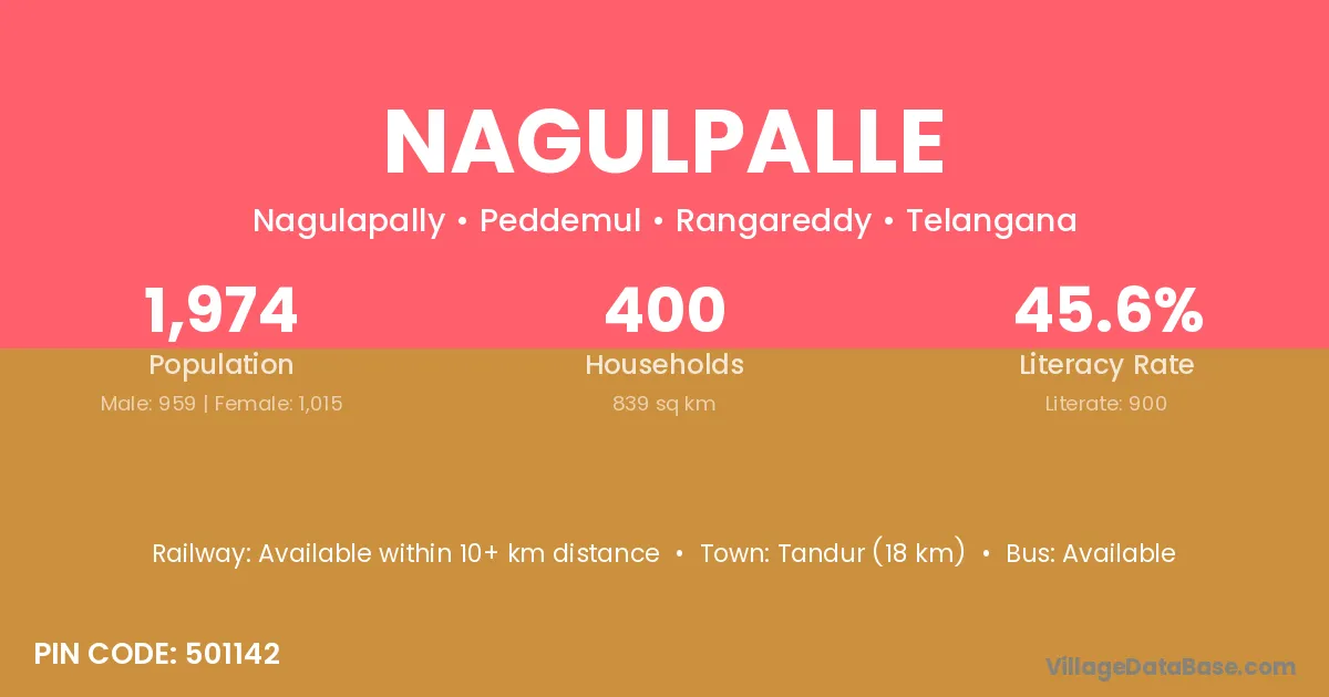 Tandur (18 km) is the nearest town to Nagulpalle village for major economic activities and is located approximately 18 km away.