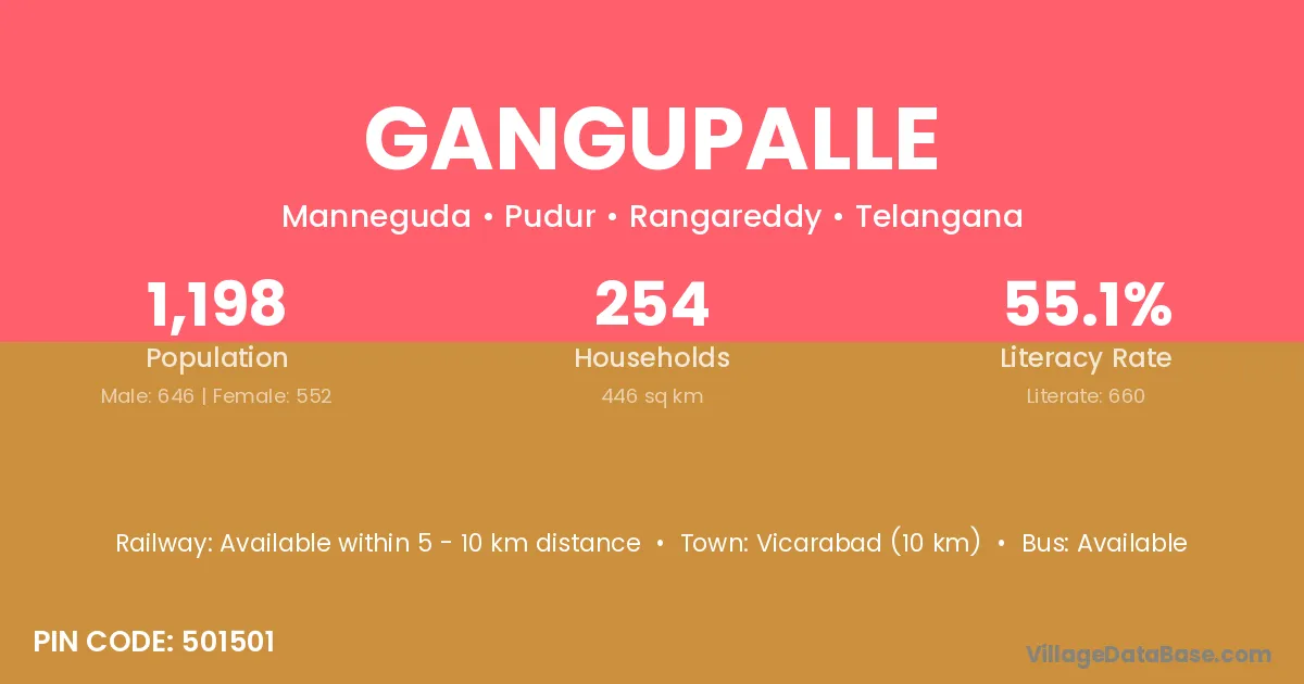 Gangupalle village has a total population of 1,198 people, of which 646 are males and 552 are females.