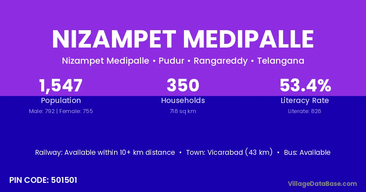 Vicarabad (43 km) is the nearest town to Nizampet Medipalle village for major economic activities and is located approximately 43 km away.