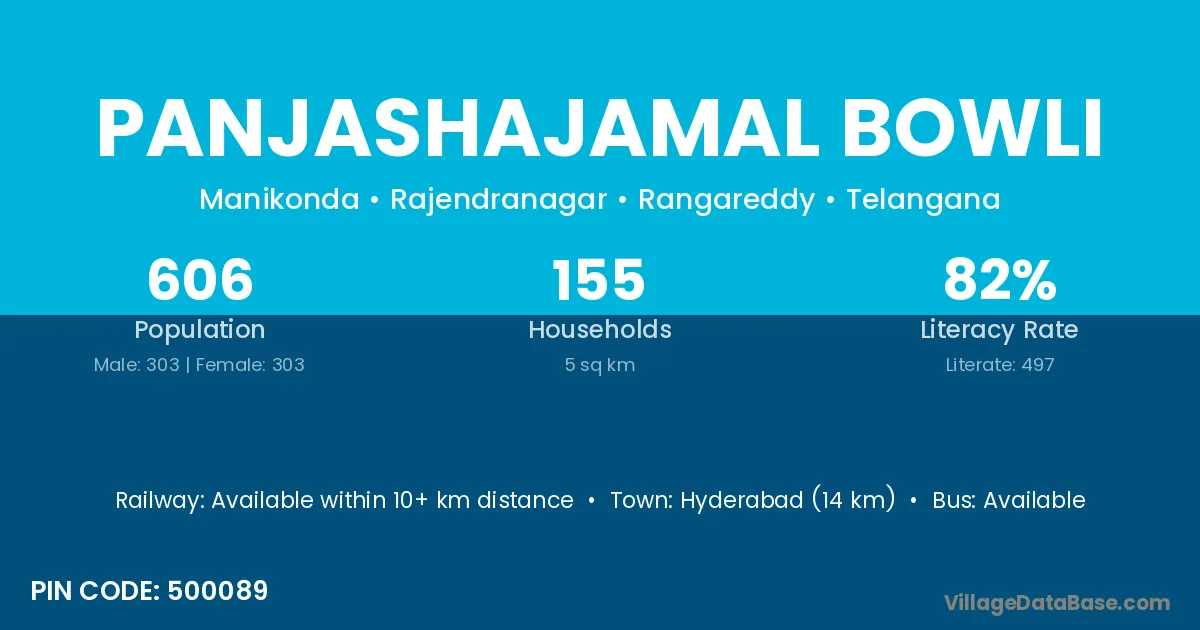 Panjashajamal Bowli village has a total population of 606 people, of which 303 are males and 303 are females.