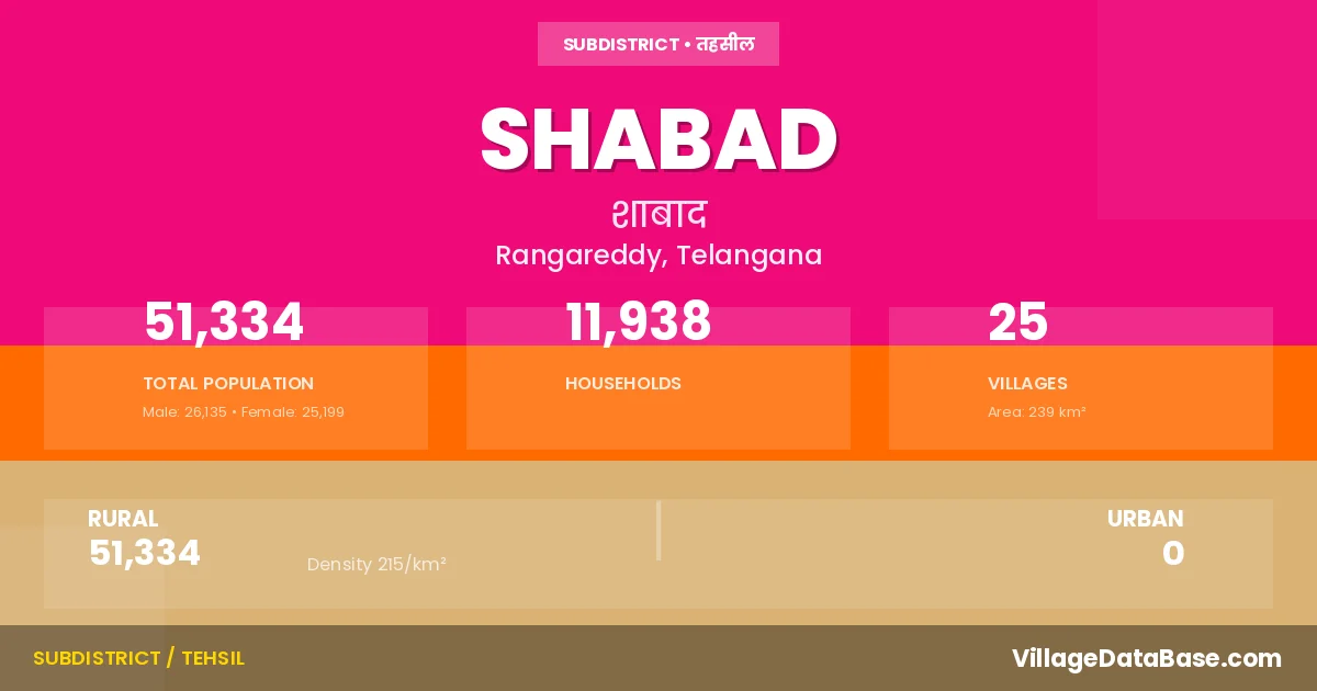 Shabad is a town and Mandal in the Rangareddy district of the Telangana. In India, a Mandal is a subdivision of a district responsible for the administration and revenue collection of a specific area within the district. Mandals play a crucial role in the local governance structure, contributing significantly to the development and administration of their communities.