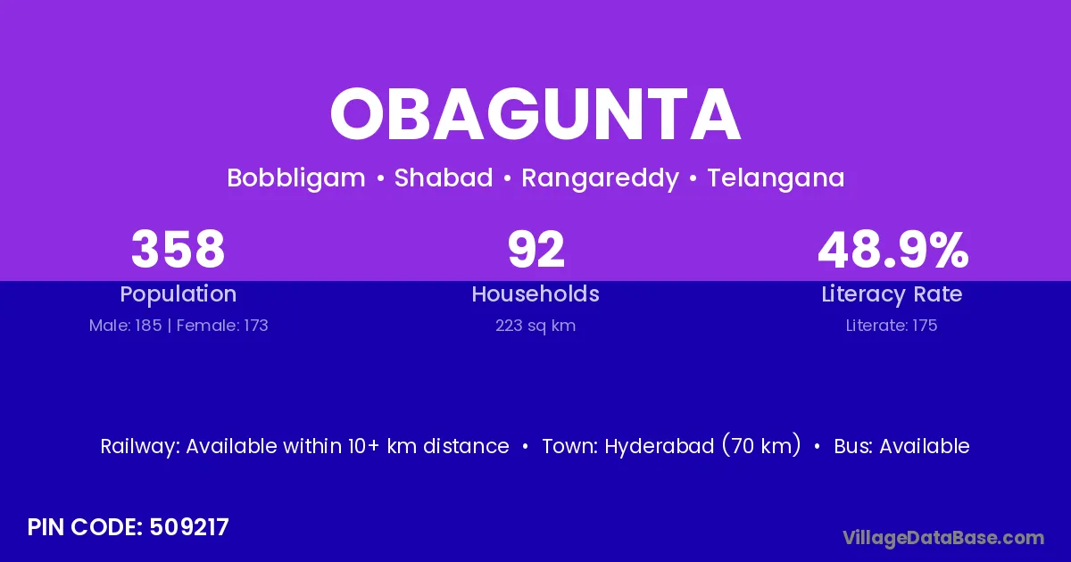 Hyderabad (70 km) is the nearest town to Obagunta village for major economic activities and is located approximately 70 km away.