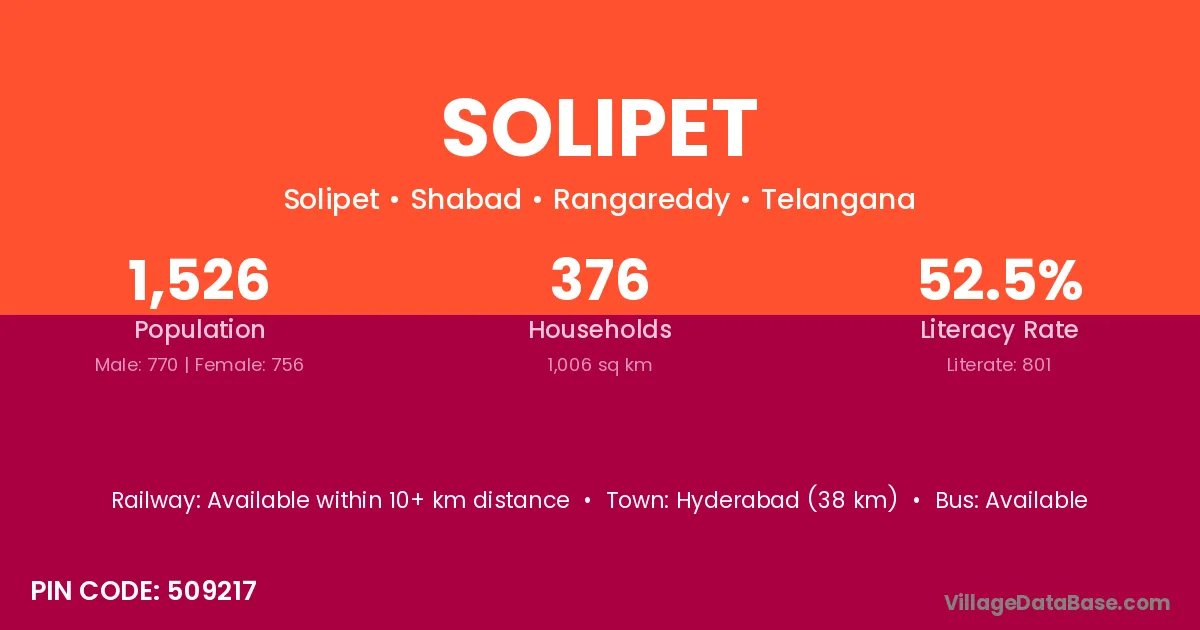 Hyderabad (38 km) is the nearest town to Solipet village for major economic activities and is located approximately 38 km away.
